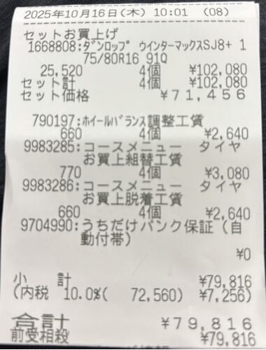 おはようございます。 朝から、ジムニーのタイヤ交換。 冬タイヤ タイヤはダンロップ ウィンターマックスsj8+ サイズは175/80R16 91Q (ダンロップ HP) 71456円、1本あたり17864円 ネットよりは流石に割高なのかな?と思って調べたら札幌で、安く買えたみた…